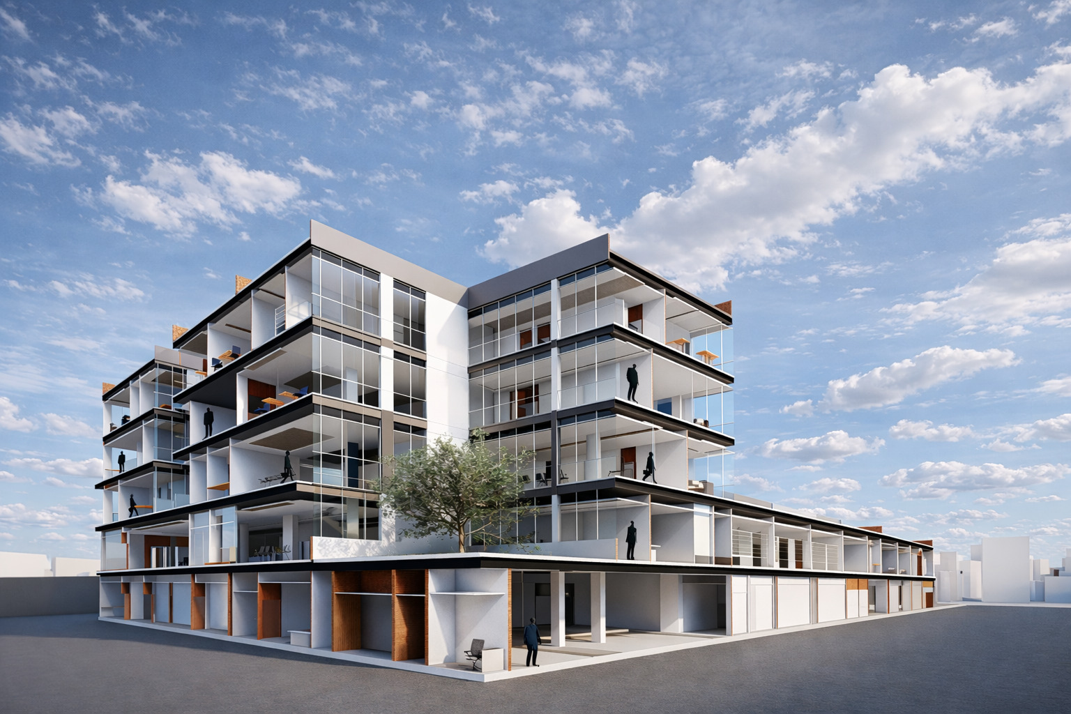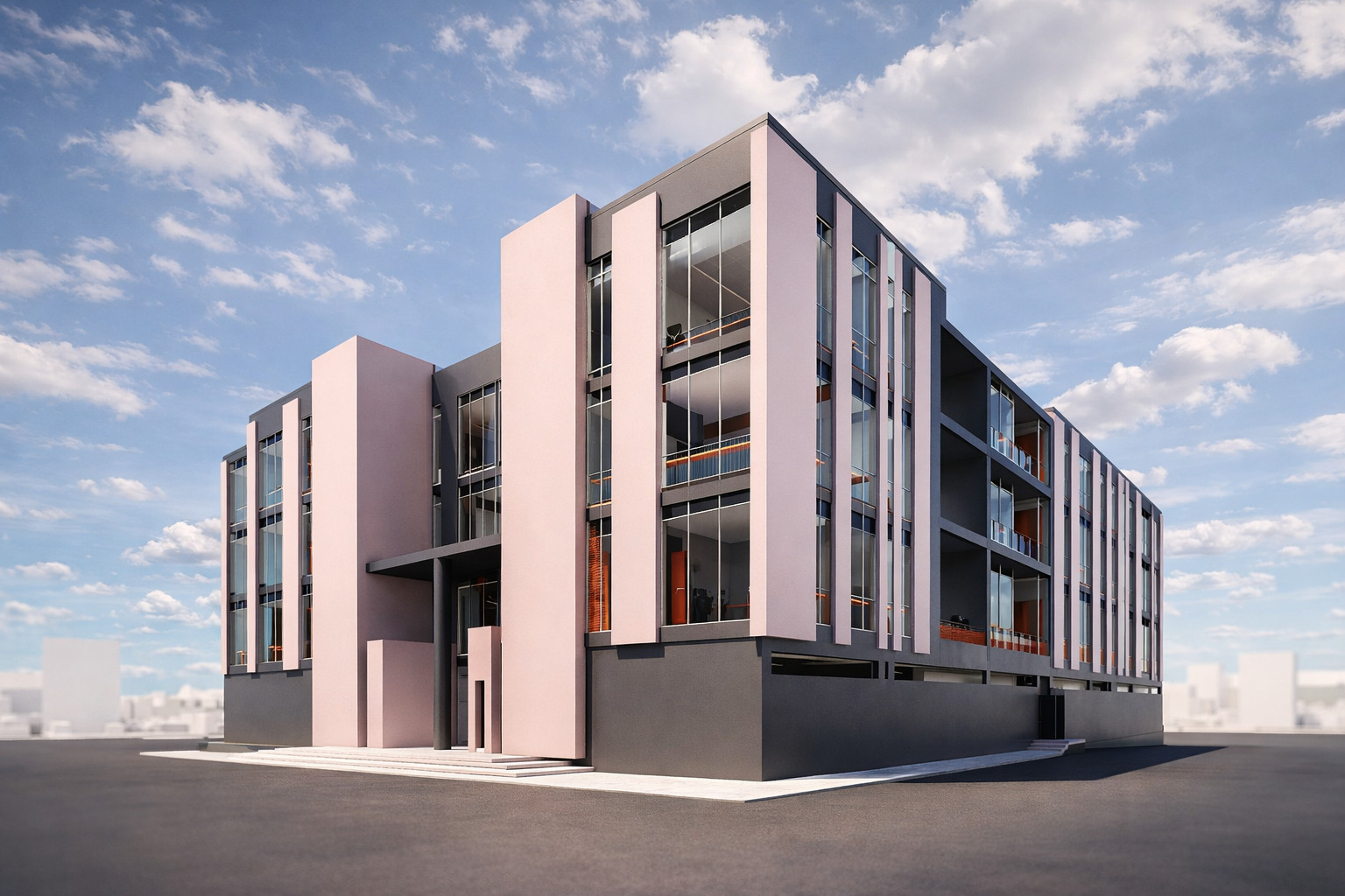 El edificio se desarrolla en cinco niveles, con un sótano y cuatro plantas sobre rasante, organizándose mediante una volumetría en forma de L en los niveles inferiores y una pieza rectangular en las plantas superiores. Dos patios interiores garantizan la iluminación natural de las áreas interiores, mejorando las condiciones de trabajo y la calidad espacial.